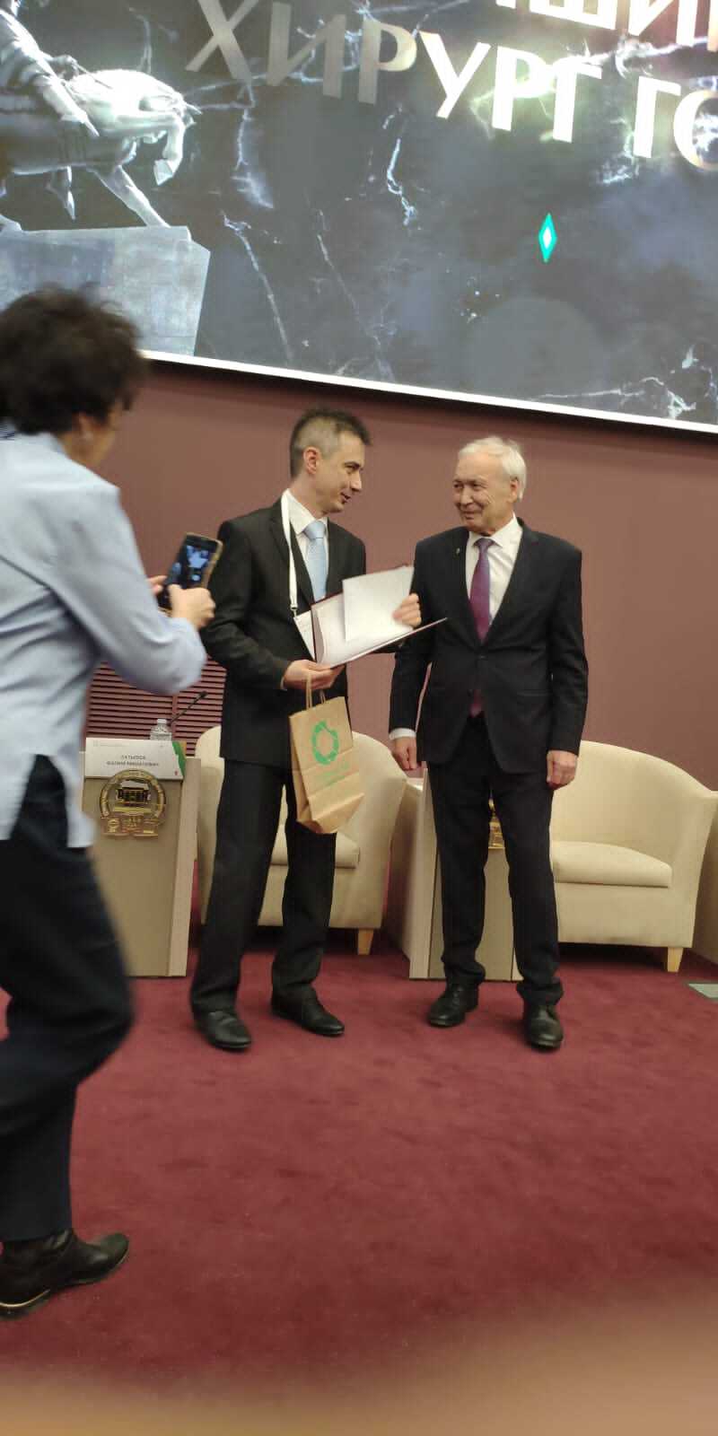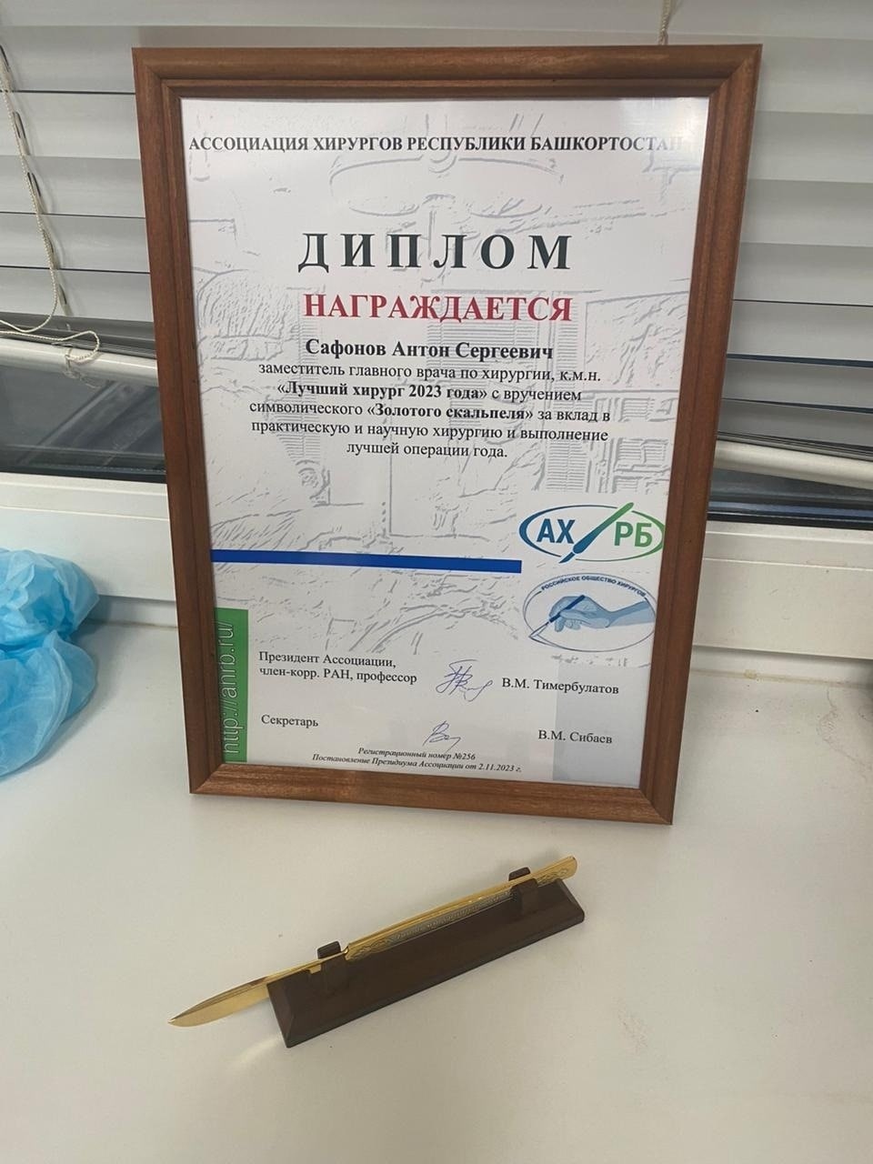 Также состоялось награждение лучших хирургов республики за 2023г. По итогам 2023 года заместитель главного врача по хирургической помощи Республиканской клинической больницы им. Г. Г. Куватова Антон Сафонов получил премию «Золотой скальпель».